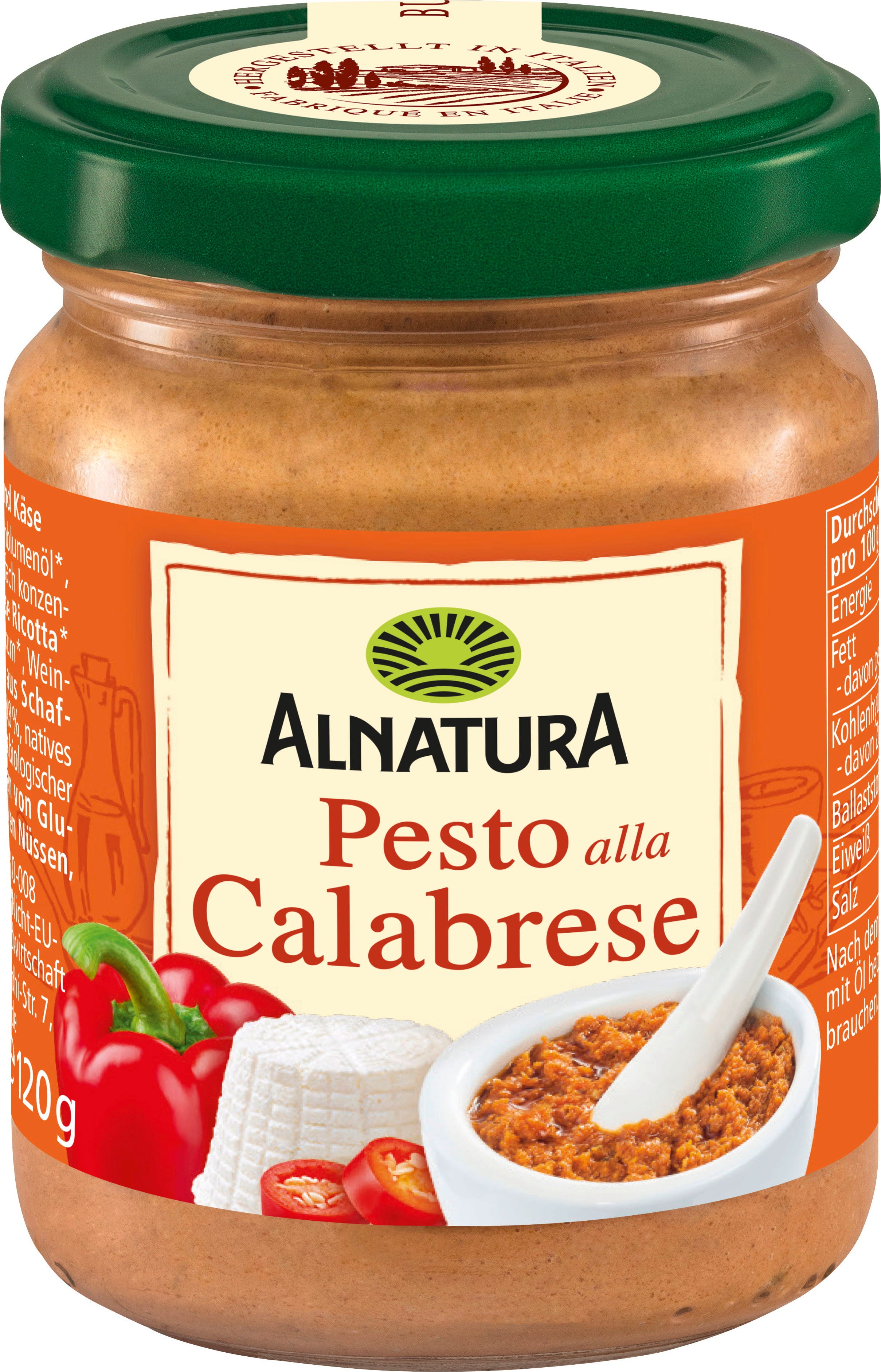 The creamy, aromatic, and spicy Organic Pesto alla Calabrese by Alnatura brings the taste of Italy to your kitchen in an instant. The base is made from peppers, tomatoes, and ricotta, refined with a hint of chilli. It is perfect with gnocchi and pasta, as a spread, a dip, or as an ingredient for sauces and soups.