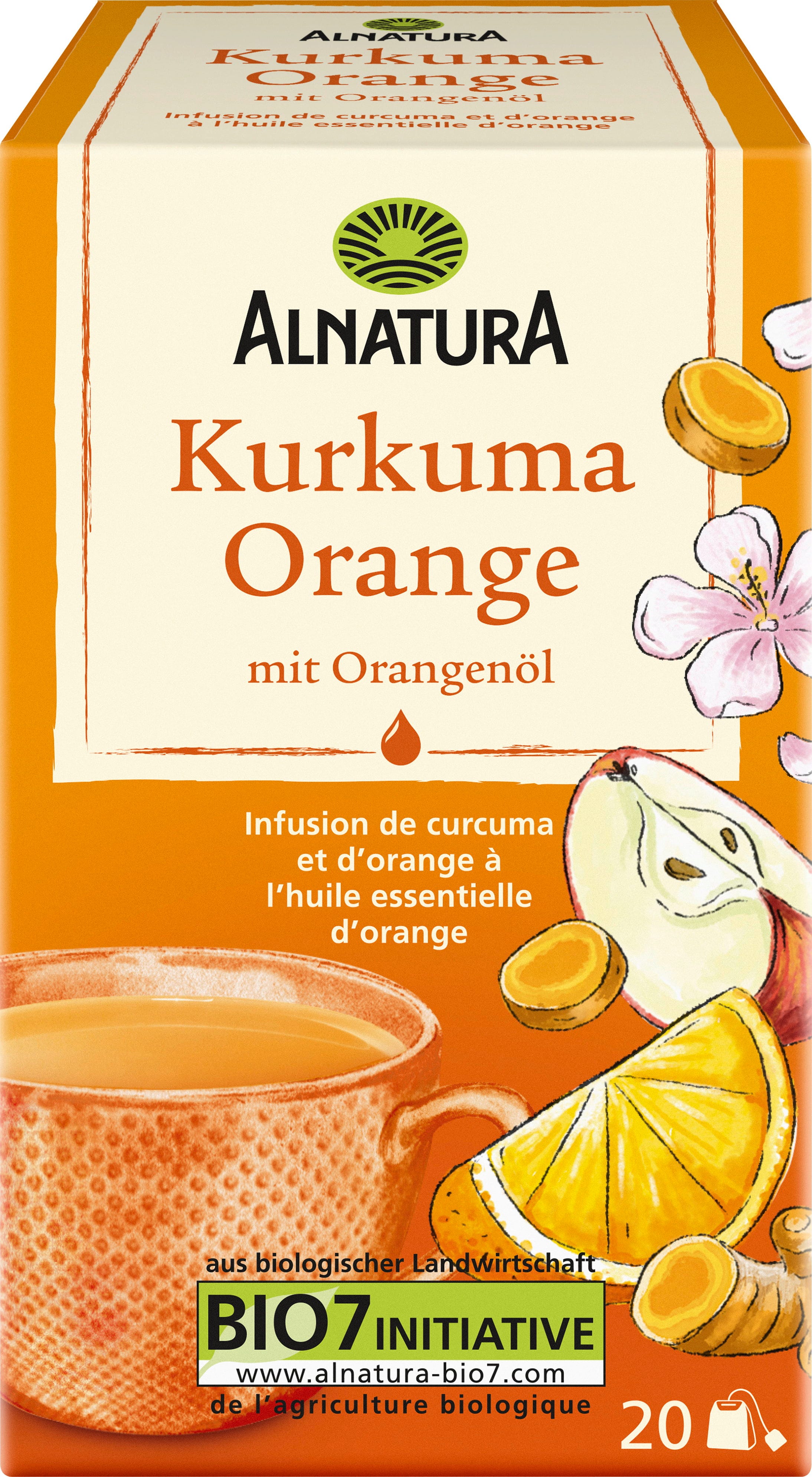 Spicy turmeric root and sweet, fruity orange oil form the golden-yellow base of Organic Turmeric & Orange Tea by Alnatura. White hibiscus and apple perfectly complement the flavour profile. All ingredients are sourced from organic farming.
