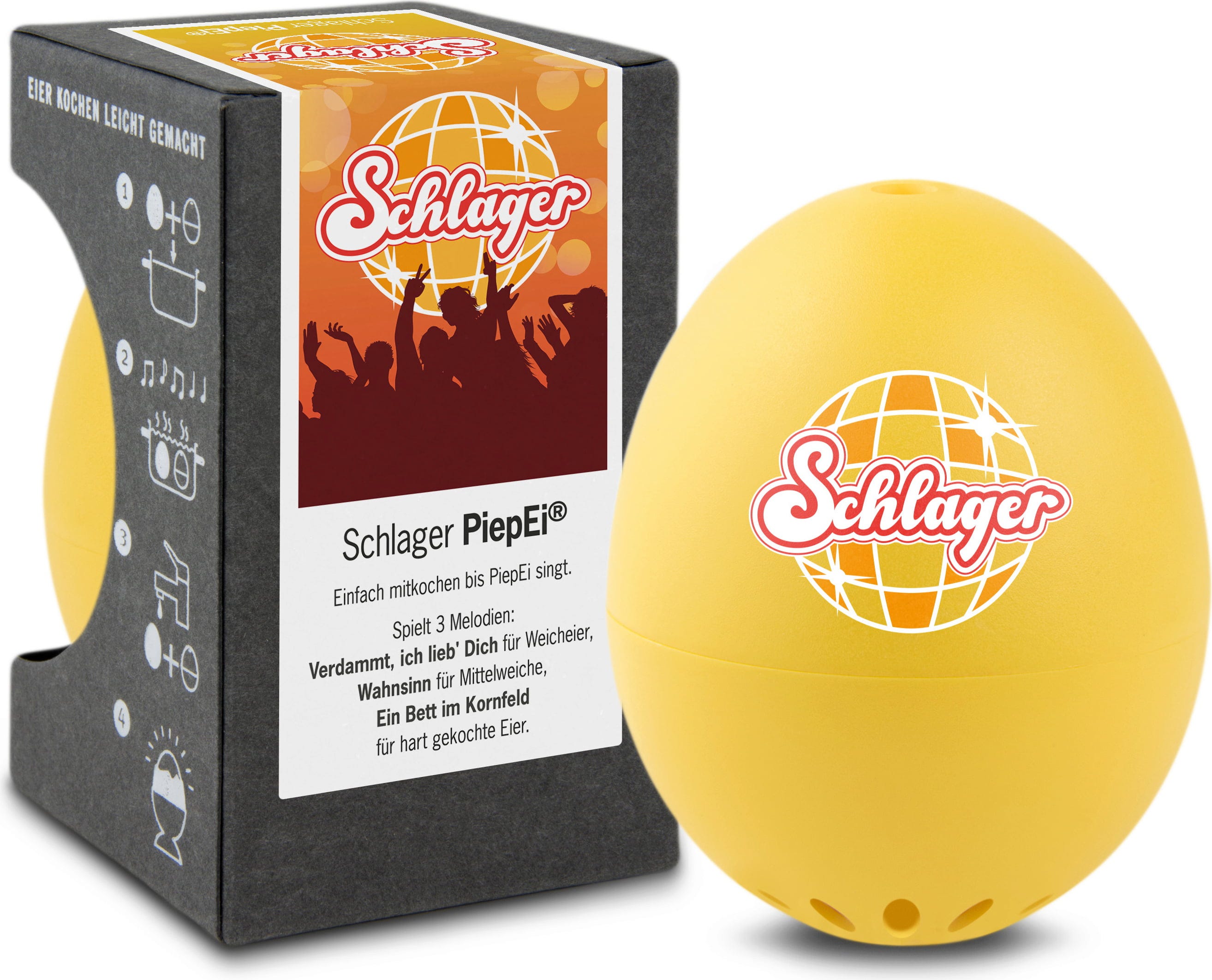 Simply place the Schlager PiepEi in the pot with the eggs, boil them together, and wait for the melody of the desired hardness to play. It works regardless of the starting water temperature, egg size, or altitude.