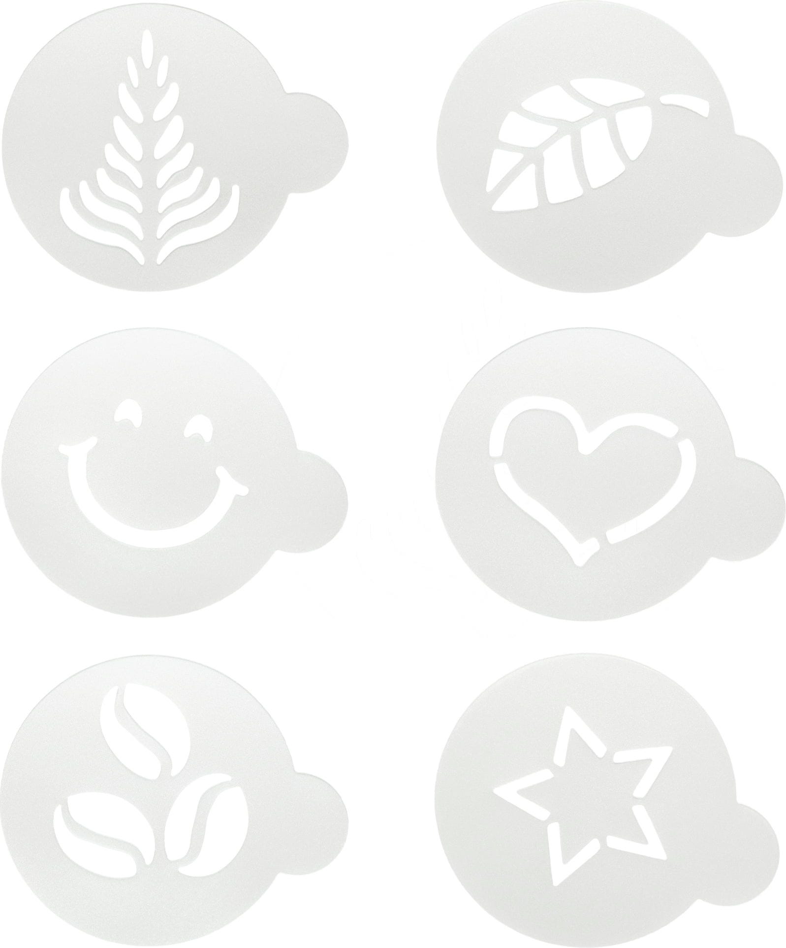 6 designs: star, heart, barista, face, leaf, coffee bean