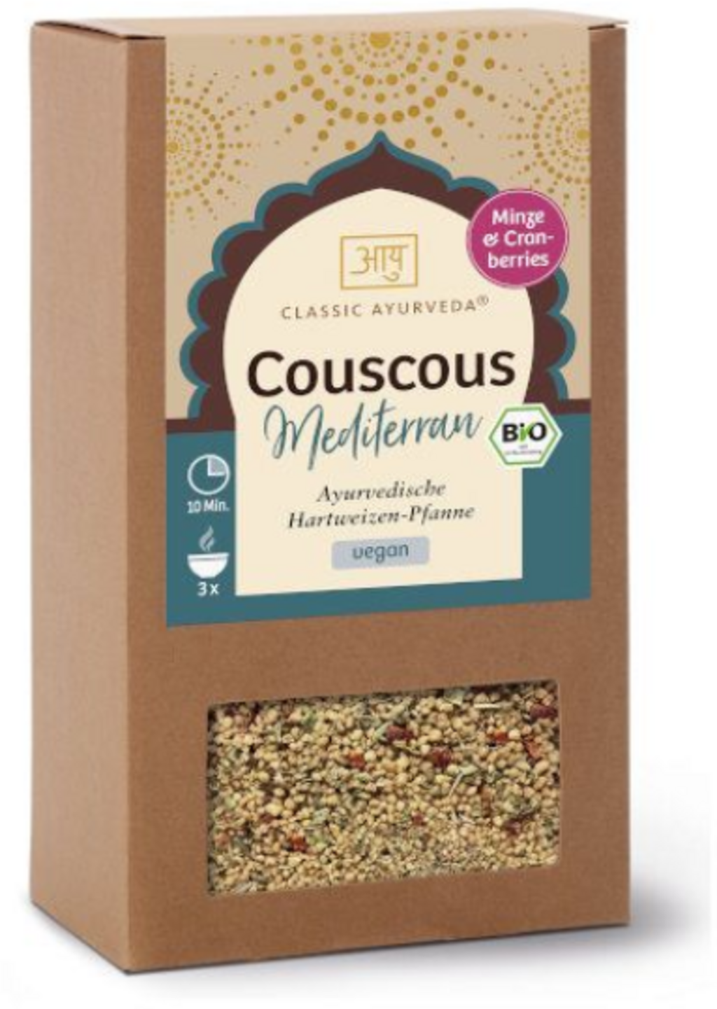 This organic Ayurvedic Mediterranean couscous is made from wholesome wholemeal durum wheat semolina and is characterised by a mild flavour. The recipe combines fruity cranberries, barberries and pomegranate flakes with a Mediterranean herb blend of thyme, marjoram, rosemary, basil and oregano. Special additions such as Tulsi (holy basil) and a pinch of asafoetida lend a unique aroma. Designed for quick and wholesome meals, it’s ideal for pan-fried dishes, fillings or salads