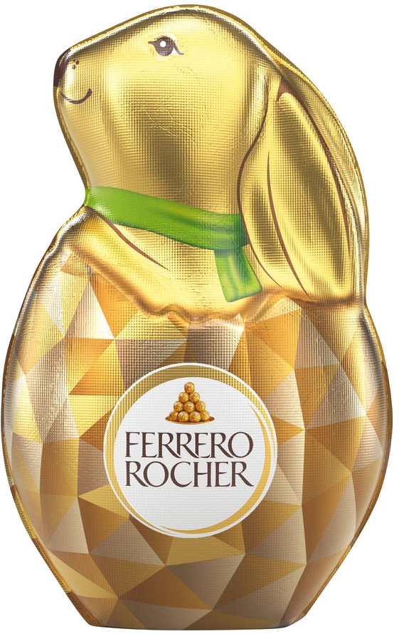 The Ferrero Rocher Easter Bunny brings an unmistakable touch of indulgence to your Easter festivities. The hollow shell of fine milk chocolate is enriched with crunchy and aromatic hazelnut pieces. Wrapped in a pretty gold foil with a modern faceted design and signature green ribbon, it is perfect as an Easter gift.