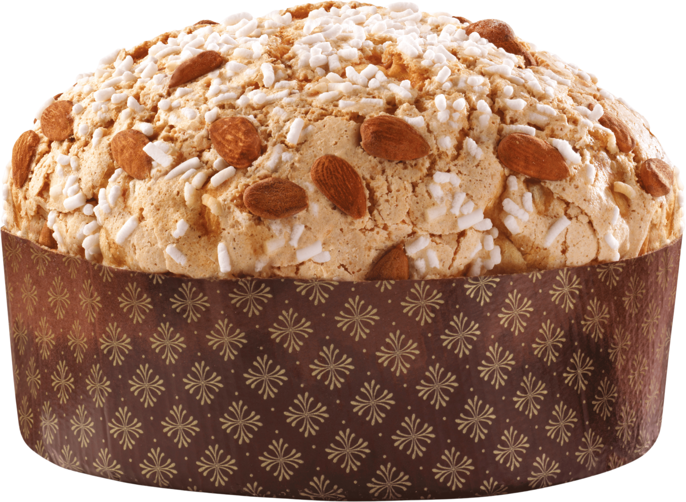 Wheat flour, 15 % Sultanas, Butter, Sugar, 8 % Orange peel (Orange peel, Glucose syrup , Fructose, Sucrose), Egg yolk, Natural sourdough (Wheat flour, Water), 4 % Candied lemon peels (Lemon peel, Glucose-fructose syrup, Sucrose, Lemon juice concentrate), Emulsifiers (mono-and diglycerides of fatty acids), Whole milk, Invert Sugar Syrup, Salt, Honey, Glucose-fructose syrup, Barley malt extract, Natural Aromas, Bourbon vanilla natural flavouring, 12 % Glaze (Sugar, Fresh Egg Whites, 9 % Hazelnuts , Rice flour, Rice starch, Powdered sugar (Sugar, Wheat starch), Sunflower oil, Natural Aromas), Coating (5 % Sugar, 3 % Almonds)