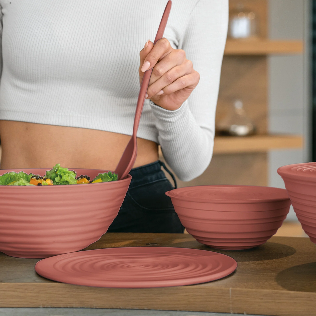 This beautiful bowl - made from around 10 recycled disposable bottles - not only impresses with its appealing hand-made look in fresh colours but also with its practical features. Thanks to the matching lid, it is suitable for serving salad, pasta, etc. at the table. It is also suitable for storing food in the refrigerator and to take with you - to a party with friends, a cosy picnic and more. Easy to clean and dishwasher safe.