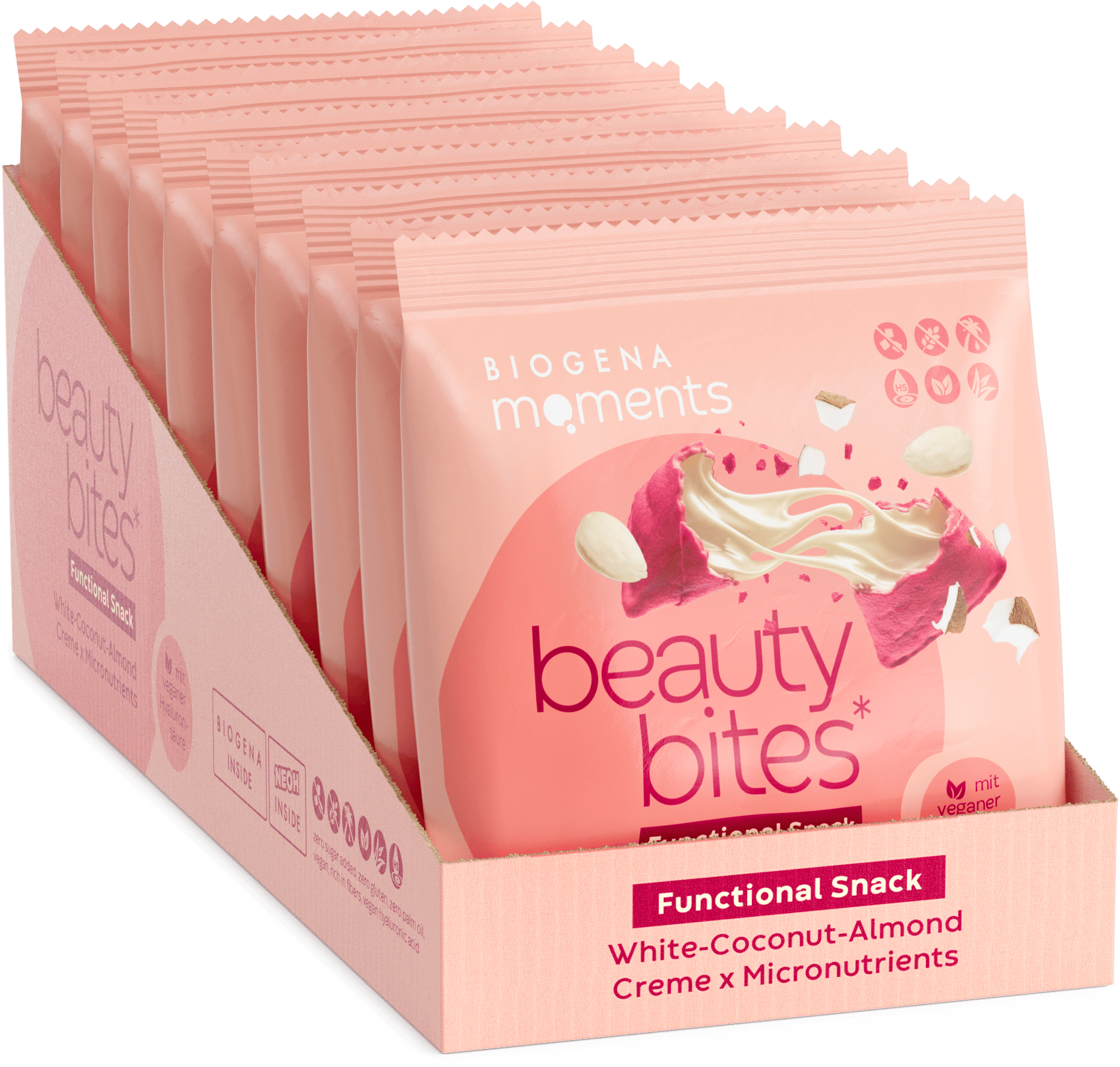 On top of 100% taste, its micronutrient profile is also quite impressive. Vegan hyaluronic acid, vitamin A, vitamin E, biotin and zinc make the beauty bites a truly functional snack from Moments by Biogena.