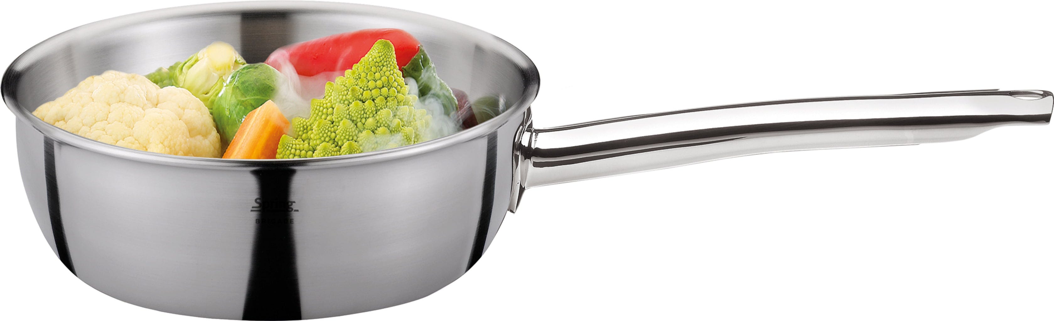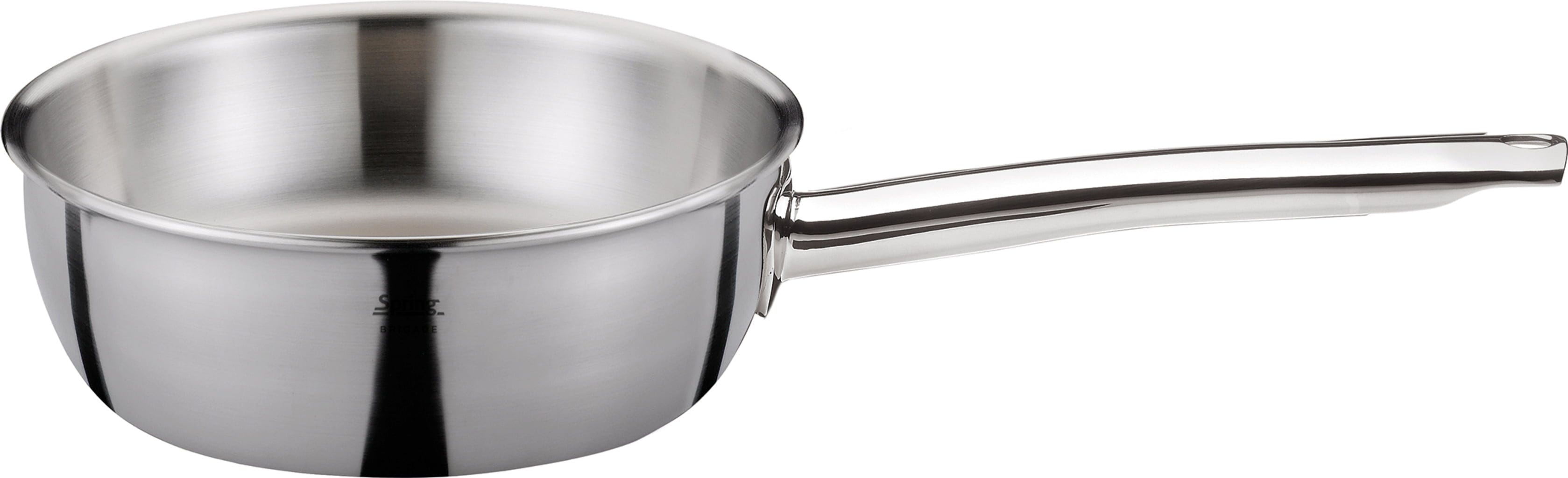 The Spring Brigade Premium Sauteuse is an indispensable tool for anyone looking for perfection when stirring, whisking and reducing sauces. Thanks to the tried-and-tested 5-fold multi-layer material, the heat is conducted quickly and evenly from the base right to the rim. The conical shape ensures that every angle is reached with the whisk, so nothing is burnt.